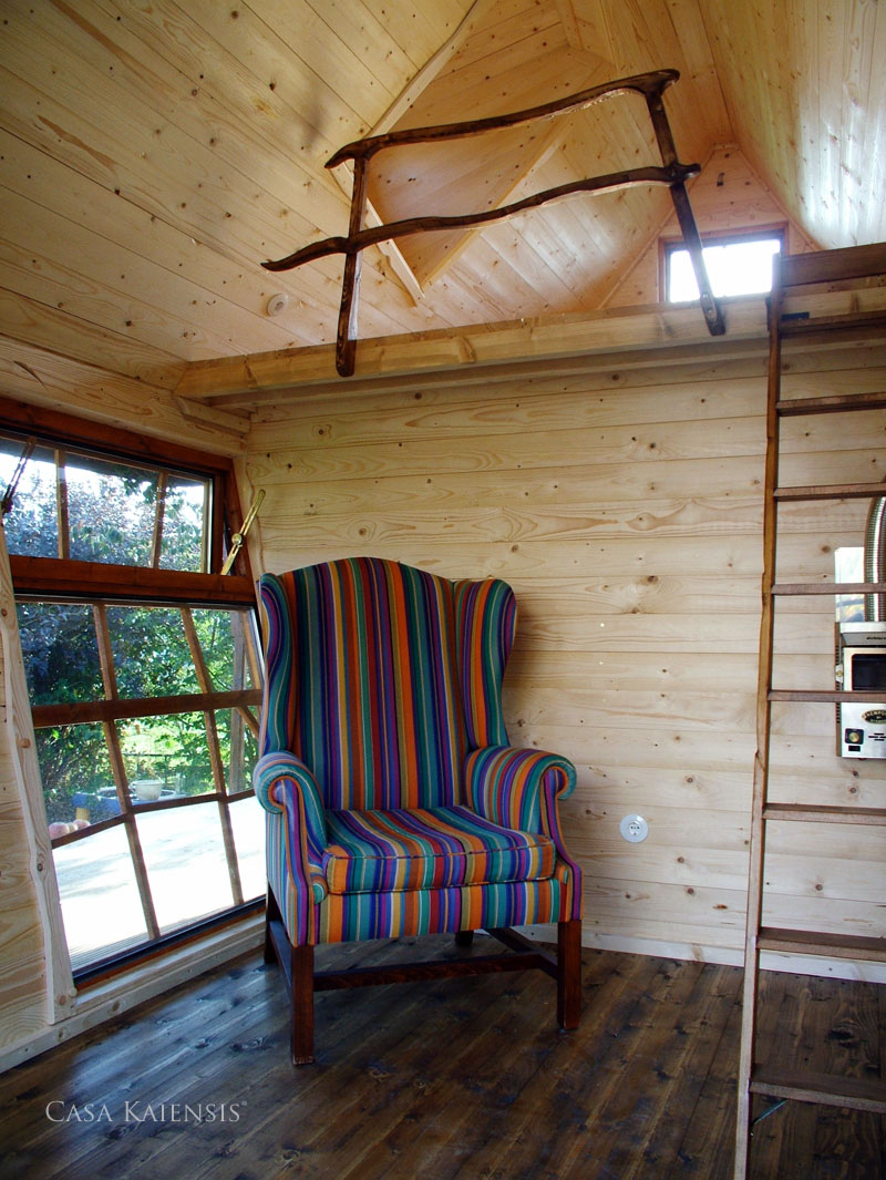 Und sooo schwer war das ja gar nicht, diese Sache mit dem Holz; es ging alles leicht von der Hand, ohne Schwierigkeiten. Das Universum, so schien es, hat Geist und Hände geführt und irgendwann traute ich mir sogar zu, das Vordach im Eingangsbereich nach meinem Gusto umzuändern. Diese Änderungen flossen kurze Zeit später in einen neuen Bauplan von Jay Shafer ein… in den Tiefen des Internets findet man auch noch einen Artikel über Jay Shafer gemeinsam mit mir als erstem Erbauer des ersten Tiny Houses in Europa.