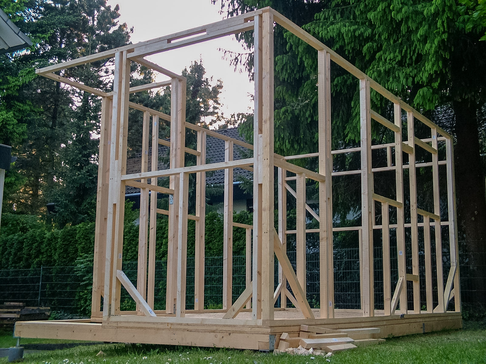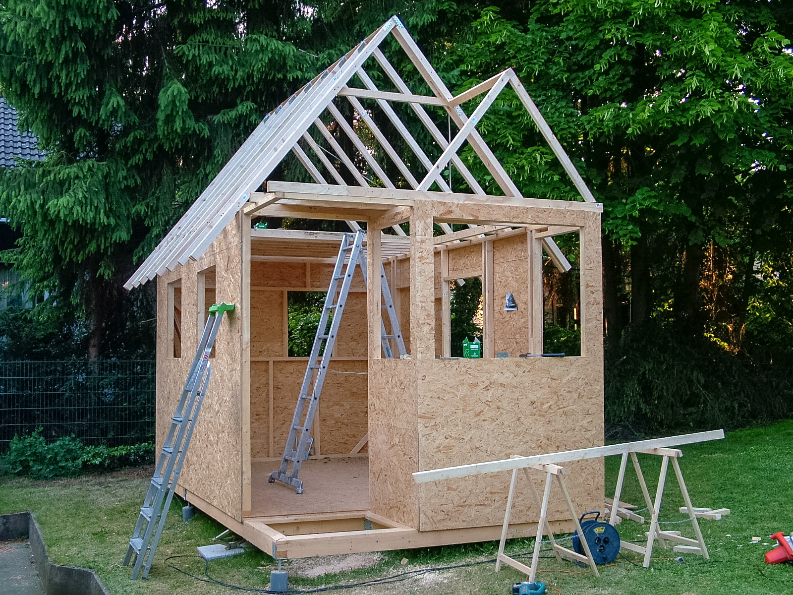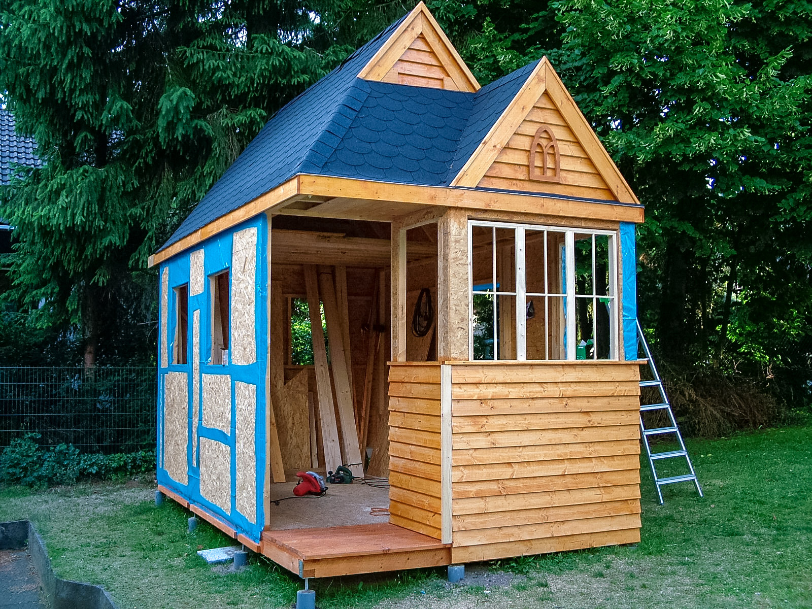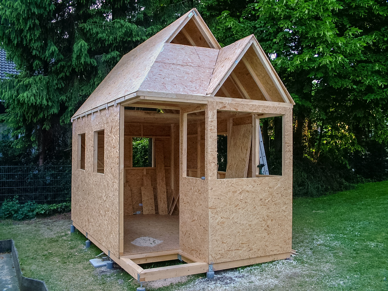 Also baute ich von Mai bis August 2008 mit Bauplänen von Jay Shafer, der im gerade aufkommenden Tiny-House-Movement in den Staaten als Tiny-House-Guru hochstilisiert wurde, ein "Wee-Bee" in meinem Garten in Bielefeld. Vom Umgang mit Holz völlig unbeleckt ging es voran und anfängliches, teilweise handwerkliches Unvermögen mündete schließlich fast schon in einer Obsession! Teilweise war ich länger auf der Baustelle zu finden als im Labor.