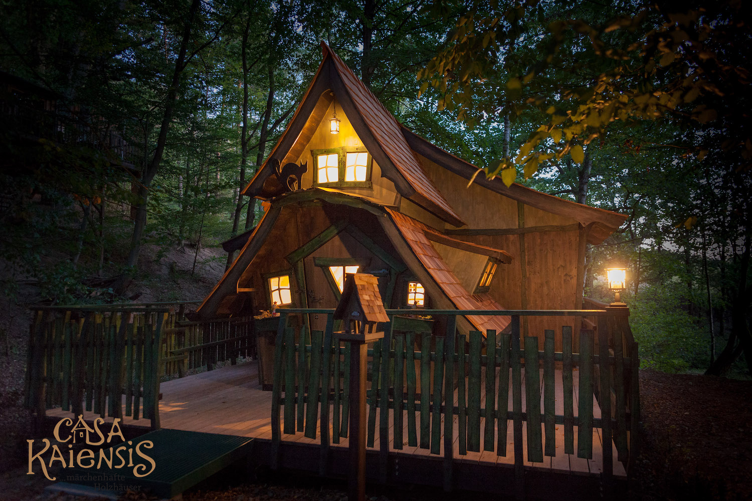 Familie Schmitt, die Inhaber des bekannten vier Sterne Hotels Schmitt, hat vor einigen Jahren hoch oben im Wald über dem malerischen Örtchen Mönchberg neben dem eigentlichen Hotel ein kleines Baumhaushotel namens Wipfelglück errichtet.