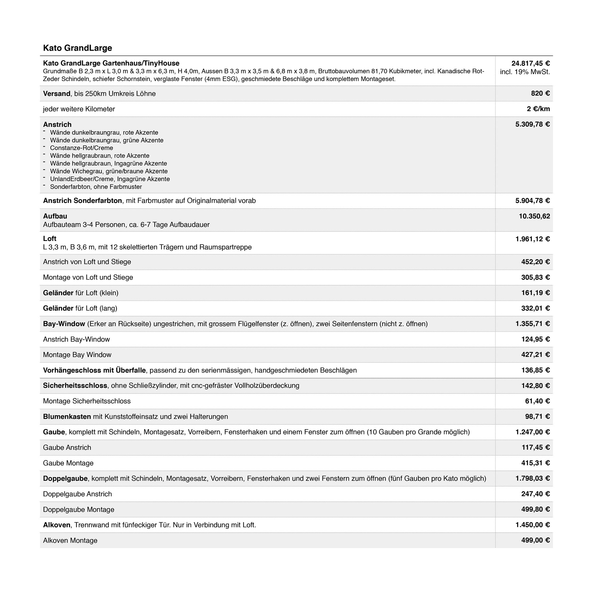 Der Bausatz enthält passend vorkonfektionierte und nummerierte Bauteile, Fußboden, Dachschindeln aus Kanadischer Rot-Zeder, handgeschmiedete Beschläge (Türbänder und -Kloben, Türschloss und Griffe, Fensterscharniere und Fenstergetriebe, Vorreiber), Montagesatz mit allen benötigten Konstruktionsschrauben (Würth Assy®), Schindelnägeln, vorkonfektionierte diffusionsoffene Unterspannbahnen (Würth WüTop®), Dichtstoffe, sowie Montageanleitung und Garantiekarte.