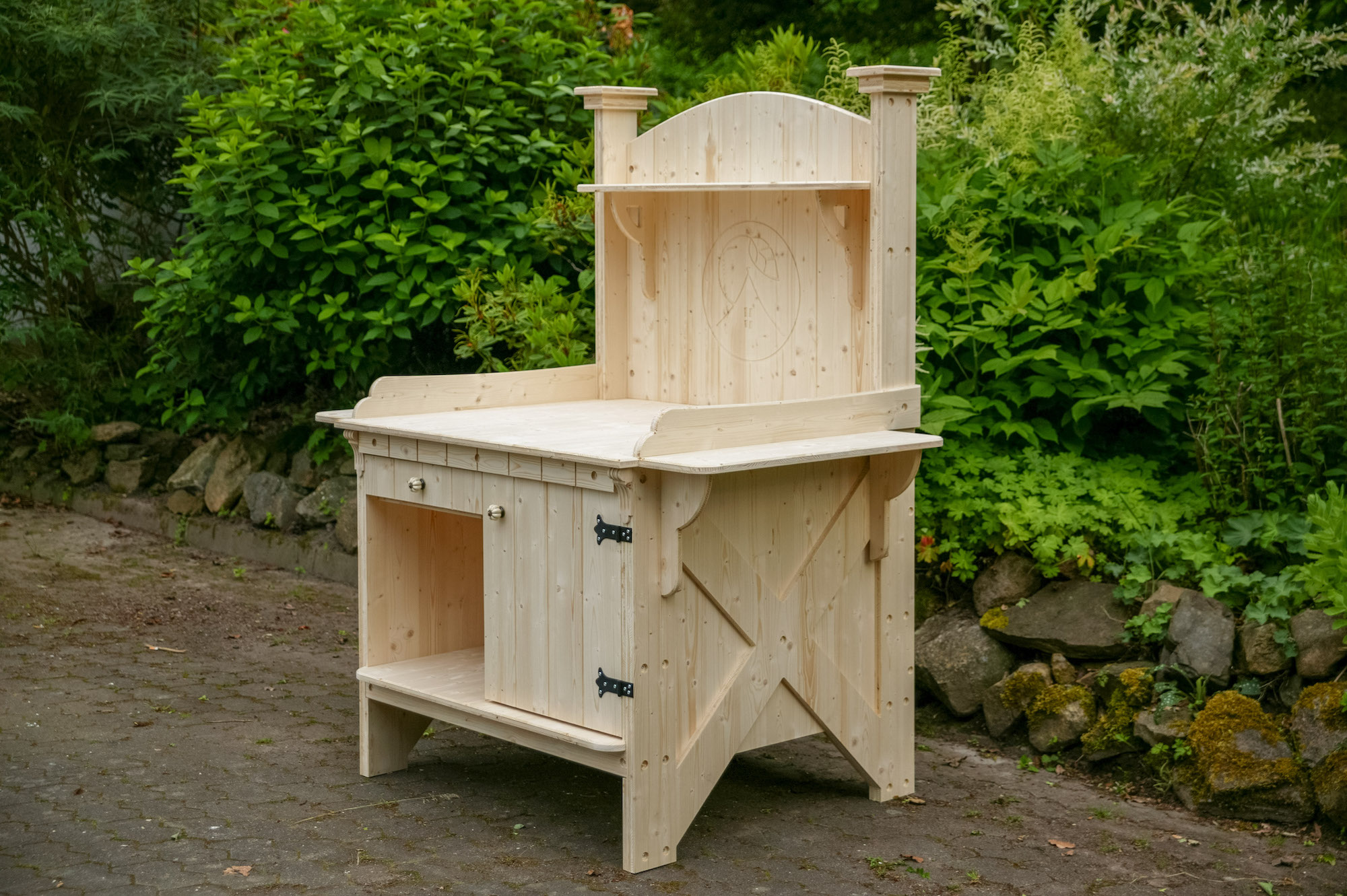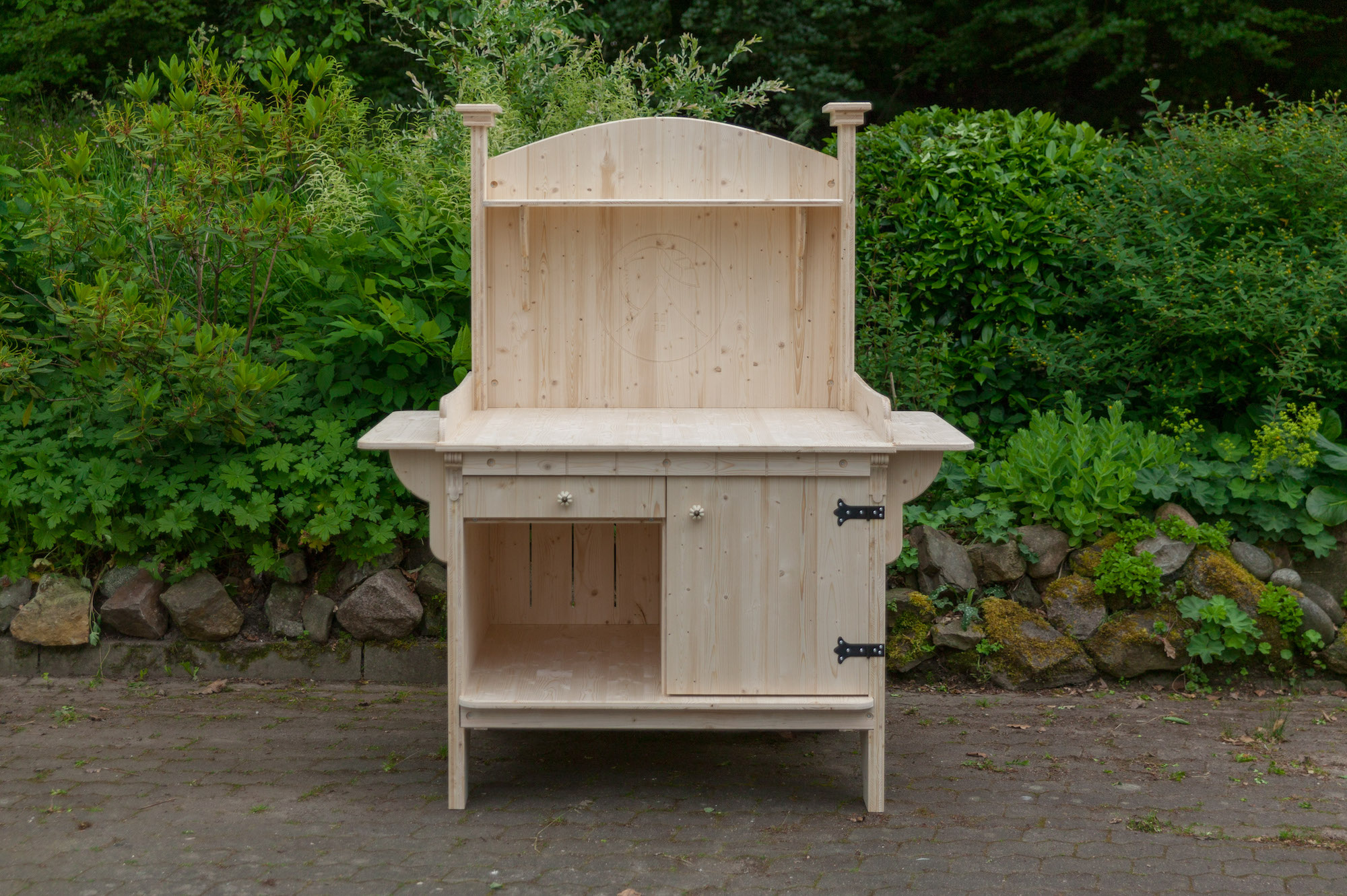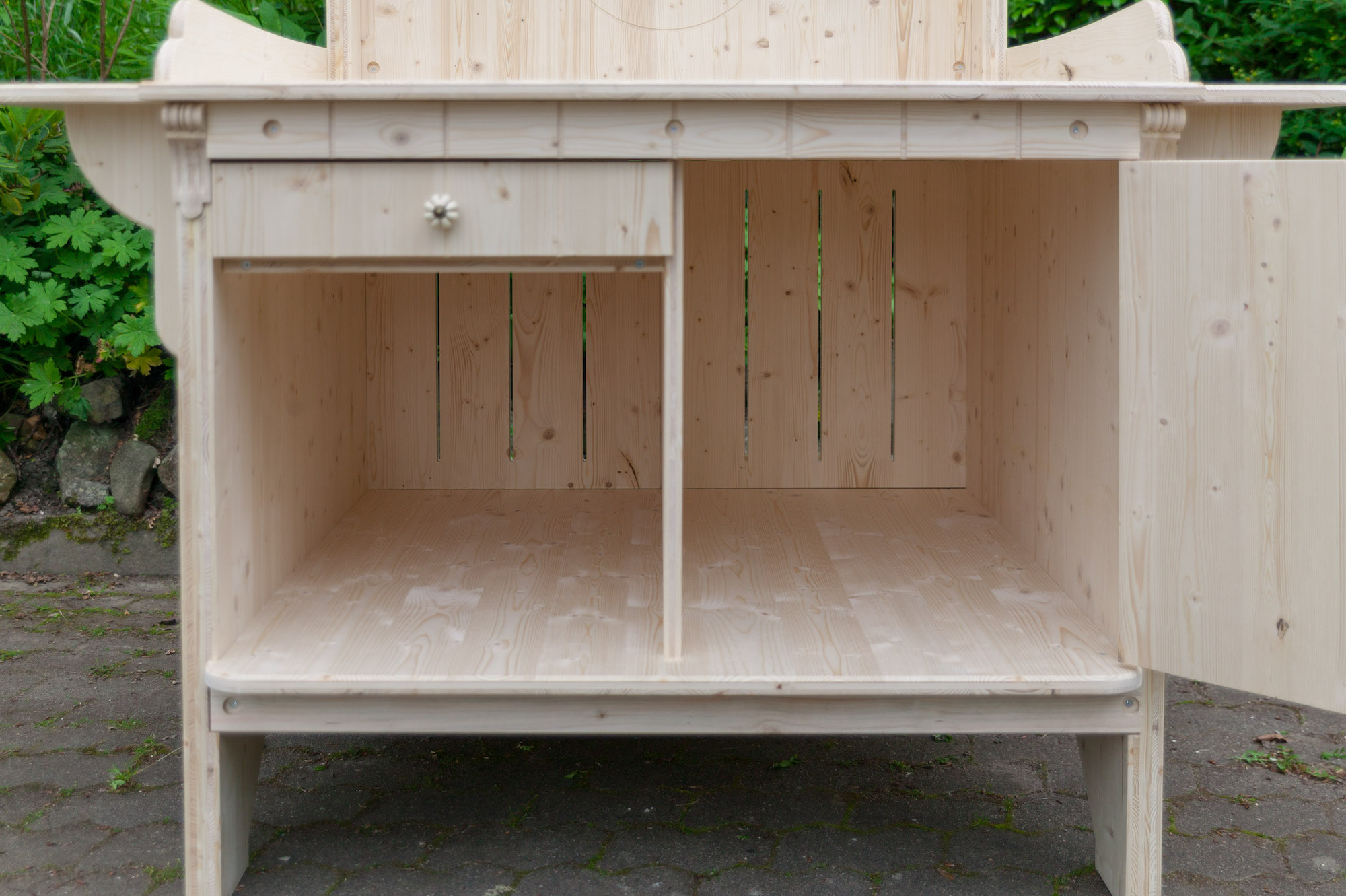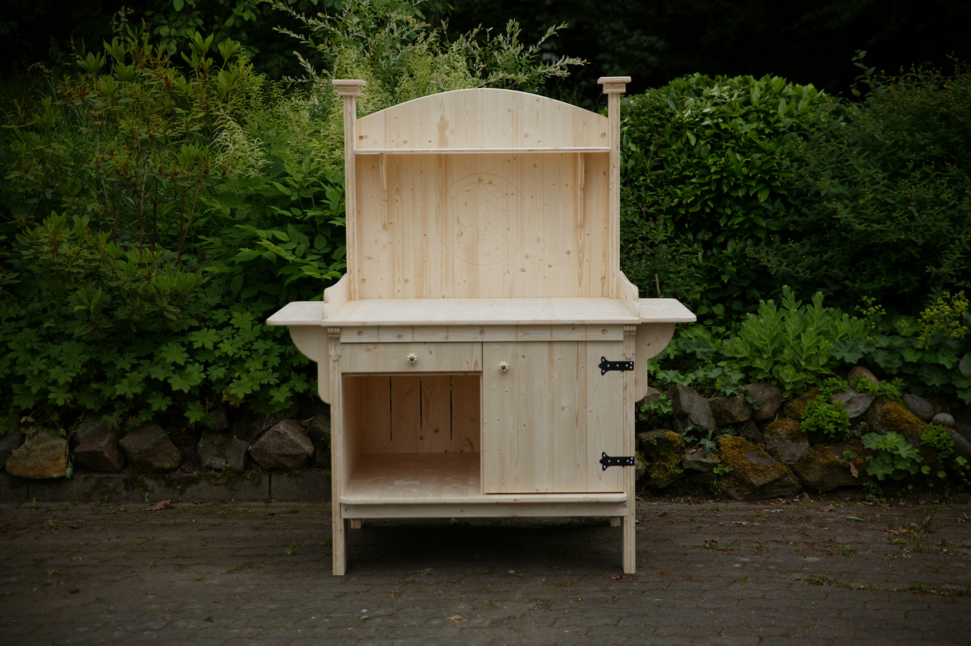 Kommt als Bausatz mit Aufbauanleitung. Alle Teile sind fertig bearbeitet, zum Teil vormontiert. Beste Verbindungselemente. Knöpfe und Scharniere können variieren, Anlieferung per Spedition oder Selbstabholung aus der Manufaktur in Gohfeld